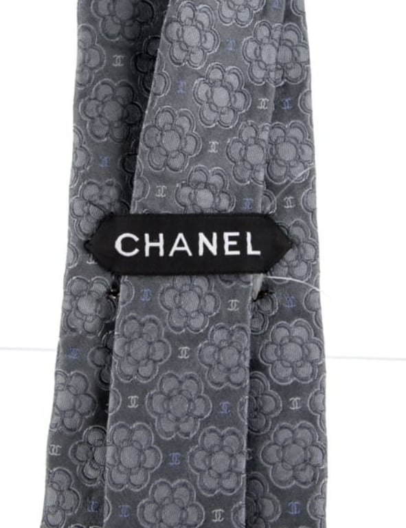 Men's grey silk Chanel tie with interlocking CC and Camellia pattern
