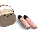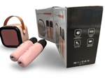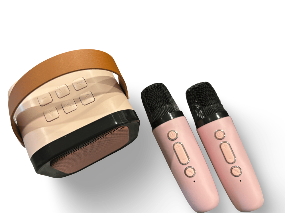 Karaoke 🎤 machine for kids; comes with 2 pink microphones and a music box that lights up in different colors; Bluetooth and auxiliary compatible.